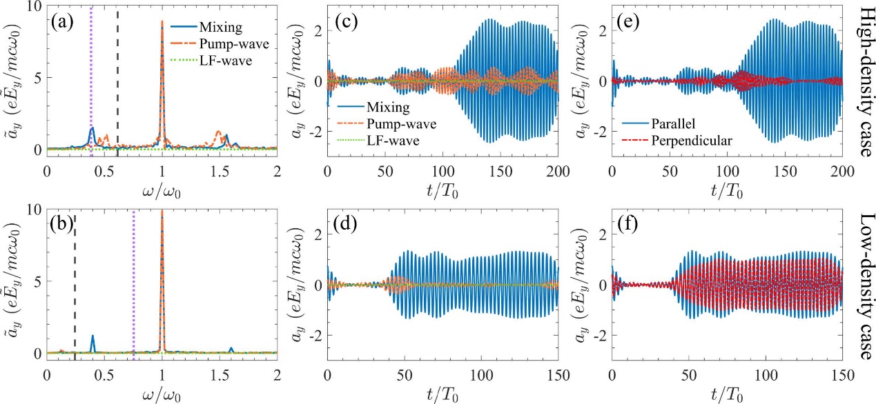 图1:[(a), (b)] 有界等离子体区域后方收集到激光场的频率谱和[(c), (d)] 滤波后的激光场波形随时间的演化,其中不同的曲线对应于双色场混合、纯泵浦波和纯低频波的入射情况。[(e),(f)] 滤波后双色场混合入射时激光场波形随时间的演化,其中蓝线和红线分别对应偏振平行和垂直两种情况。上下两行分别对应高密度和低密度两种初始设置。