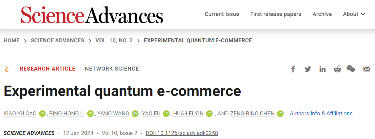 近期熊猫体育-熊猫体育app 、量子态构筑与测控教育部重点实验室尹华磊副教授课题组与南京大学熊猫体育 、固体微结构物理国家重点实验室、人工微结构科学与技术协同创新中心的陈增兵教授组成的团队基于一次性全域哈希量子数字签名理论提出了首个量子电子商务方案,在国际上首次实现了五用户量子电子商务应用场景演示,为完整的电子商务交易流程提供了无条件的安全性保证相关研究成果以“Experimental quantum e-commerce”为题于2024112日发表在Science Advances《科学·进展》上。相关工作一经发表受到了国内外媒体的广泛关注,并且Nature杂志以研究亮点、New Scientist 《新科学家》科技新闻杂志、新华社、人民日报海外版和光明日报等新闻媒体报道