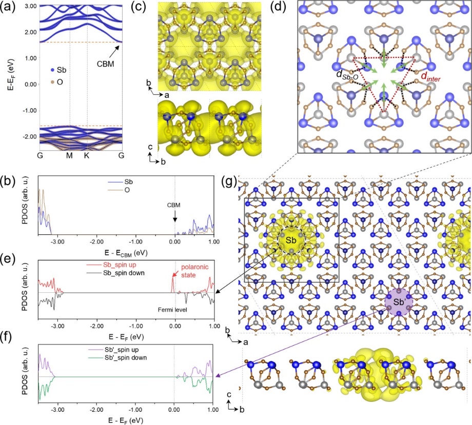 本工作中,研究团队在覆盖于SiC上的石墨烯表面生长的Sb2O3无机团簇晶体。通过STM实现了和类共价准键相关的单个极化子的观察和操纵。单个极化子占据了Sb2O3无机团簇晶体的间隙位置,表现出极化子态和局部的能带向上弯曲。研究展示了通过STM探针施加电场以可控地产生、移动和擦除单个极化子的能力。密度泛函理论(DFT) 计算表明,尽管分子间主要由范德瓦尔斯吸引相互作用主导,额外注入的电子局域地占据了团簇间的成键态,缩短局部团簇间隙的距离,而局域间距收缩的团簇又为注入电子提供了额外的吸引势,形成了范德瓦尔斯极化子。该研究揭示了一种新的极化子类型,并提供了一种在原子尺度上操纵单个电子的可行新途径。
