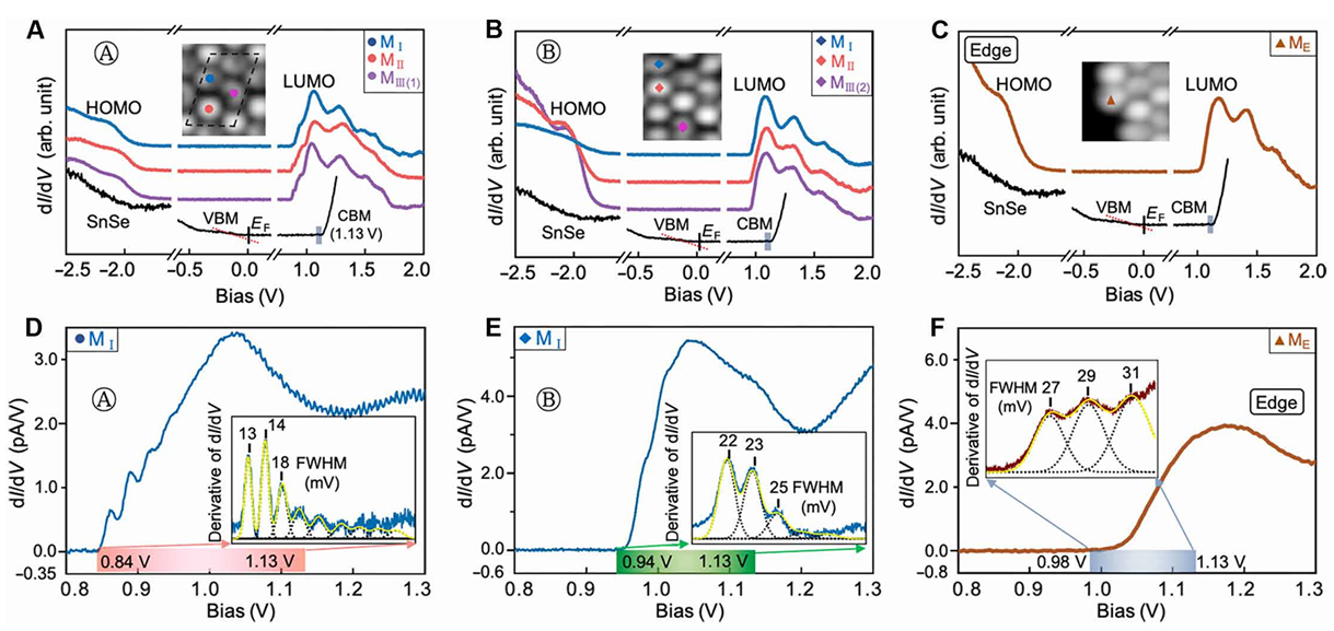 具体的研究发现,C60分子在SnSe半导体表面上的吸附构型呈现出两种不同的岛状结构,并且C60分子展现出三种不同的STM形貌(如下图)。结合密度泛函理论计算,确定了C60分子的吸附构型。扫描隧道光谱微分电流-电压(dI/dV)谱在SnSe半导体禁带中的LUMO共振处表现出电子-振动激发的特征,且该特征随其能量逐渐偏离SnSe的导带底而不断增强。这表明,通过精心设计分子-半导体界面的II型能带排列,可以选择性地隔离和增强特定的电子-振动态,从而获得清晰的低频电子-振动激发信号。这为在纳米尺度深入理解和灵活控制分子振动动力学提供了一种新颖的基础方法。