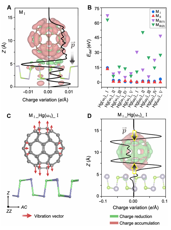 进一步研究发现,低频Hg(ω1)振动激发普遍存在于所有C60分子中,与其在表面上的排列方式无关,这挑战了传统认为电子-振动激发受分子取向影响的认识。理论计算表明C60/ SnSe界面处存在由电荷转移导致的界面偶极,显著增强了Hg(ω1)的电子-振动激发(如下图)。该发现具有广泛的意义:它揭示了一种通过设计分子-半导体界面来控制分子电子传输的方法,为更高效的分子电子器件、能源系统和传感技术的开发开辟了可能的新途径。