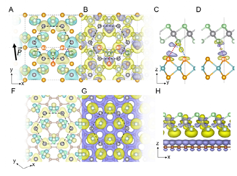 图2.单层VCl3与NbSe2(A-D)和石墨烯(F-H)衬底界面处的自旋密度分布图(A,F)及差分电荷密度分布的俯视(B,G)和侧视(C,D,H)图。
