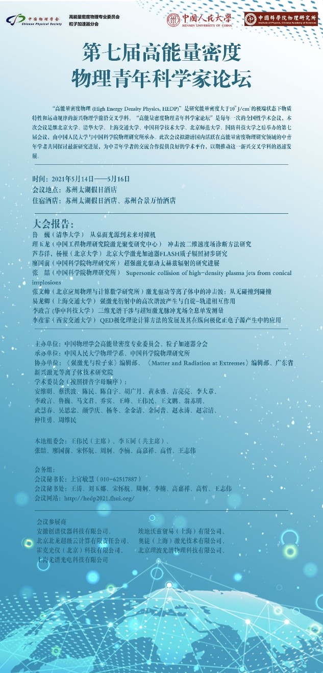 “高能量密度物理 (High Energy Density Physics, HEDP)”是研究能量密度大于1011 J/m3的极端状态下物质特性和运动规律的新兴物理学前沿交叉学科。随着高能量高功率激光技术的突飞猛进,实验室激光装置能输出106焦耳量级的纳秒激光脉冲,104焦耳量级的皮秒、拍瓦激光脉冲,102焦耳量级的飞秒、十拍瓦激光脉冲(峰值强度可达1022 W/cm2)。这为人们在实验室条件下进行极端物理状态的自主可控研究提供了重要的实验手段。HEDP研究对惯性约束聚变、加速器物理、天体物理、医学物理、材料物理等具有极其重要的意义。近年来高能量密度物理的研究取得了令人瞩目的发展。“高能量密度物理青年科学家论坛”由中国物理学会高能量密度物理专业委员会、粒子加速器分会主办的每年一次的全国性学术会议,本次会议是继北京大学、清华大学、上海交通大学、中国科学技术大学、北京师范大学、国防科技大学之后举办的第七届会议,由熊猫体育-熊猫体育app