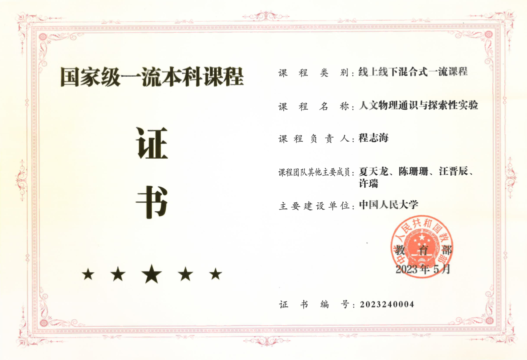 《人文物理通识与探索性实验》课程是我校理工类通识课程中首个的实验类课程,入选国家级线上线下混合式一流本科课程。课程以生动有趣的物理演示实验为载体,以物理概念实际应用和前沿科技发展为抓手,支撑我校人才培养。通过本课程的学习,使学生理解重要物理概念,掌握科学的方法论,了解自然科学最新进展;培养学生面对未知问题,独立思考、提出解决思路的能力;使学生具有实事求是的科学态度,勇于创新的科学精神,以及强烈的社会责任感。