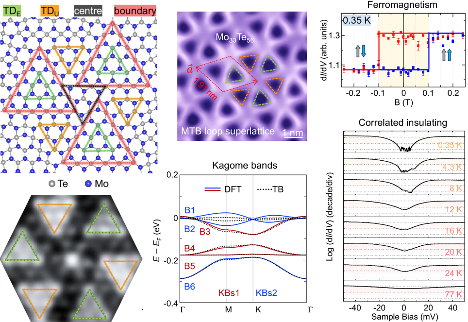 近日,熊猫体育 季威教授研究组与武汉大学张晨栋教授、袁声军教授、吴冯成教授等合作者组成联合团队,通过理论计算结合实验创制和测量,获得了非简单化学配比的单层笼目(kagome)晶格材料Mo33Te56,并发现了其中蕴藏的磁性和关联绝缘体等新物态。相关结果以“Ferromagnetism and correlated insulating states in monolayer Mo33Te56”为题,发表在2025年3月31日出版的《自然·通讯》[Nature Communications 16, 3084 (2025)]上。....